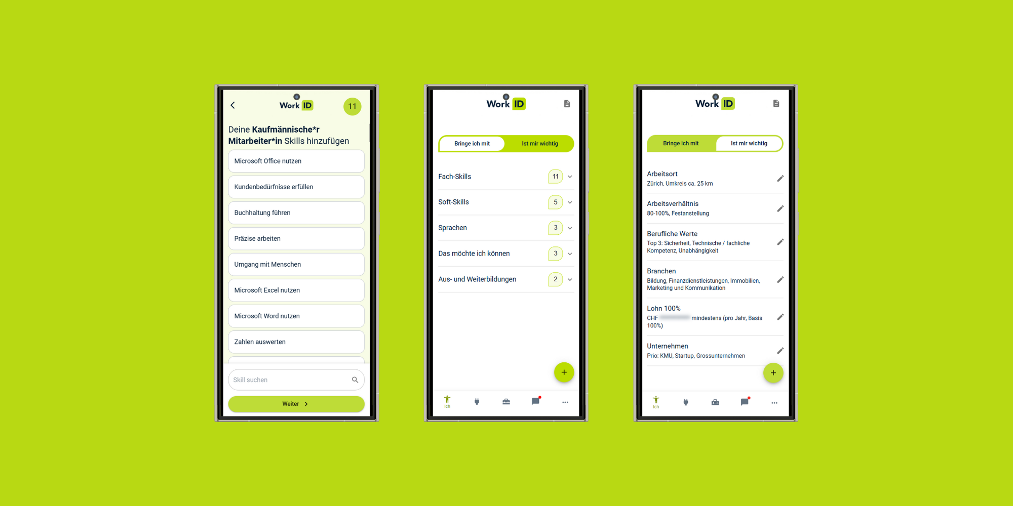 Die «Work-ID AG» bringt Menschen und Unternehmen zusammen, die wirklich zueinander passen. Für Arbeitnehmende ist die Work-ID der digitale Skills-Ausweis und wächst ein Arbeitsleben lang mit. Sie machen damit sichtbar, was sie können und was ihnen wichtig ist. Damit Unternehmen die Skills erkennen und nutzen können, erhalten sie mit dem Skills-Manager ein Werkzeug, das ihnen zeigt, wer zu ihnen passt. Intern und extern. Damit sie keine passenden Menschen mehr übersehen.
