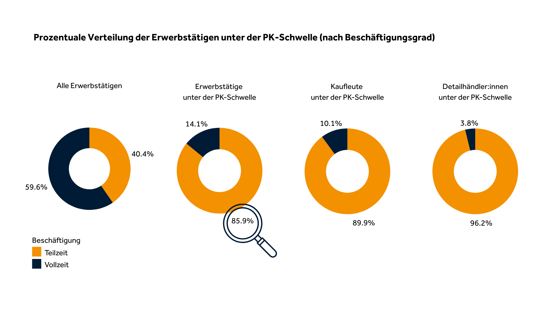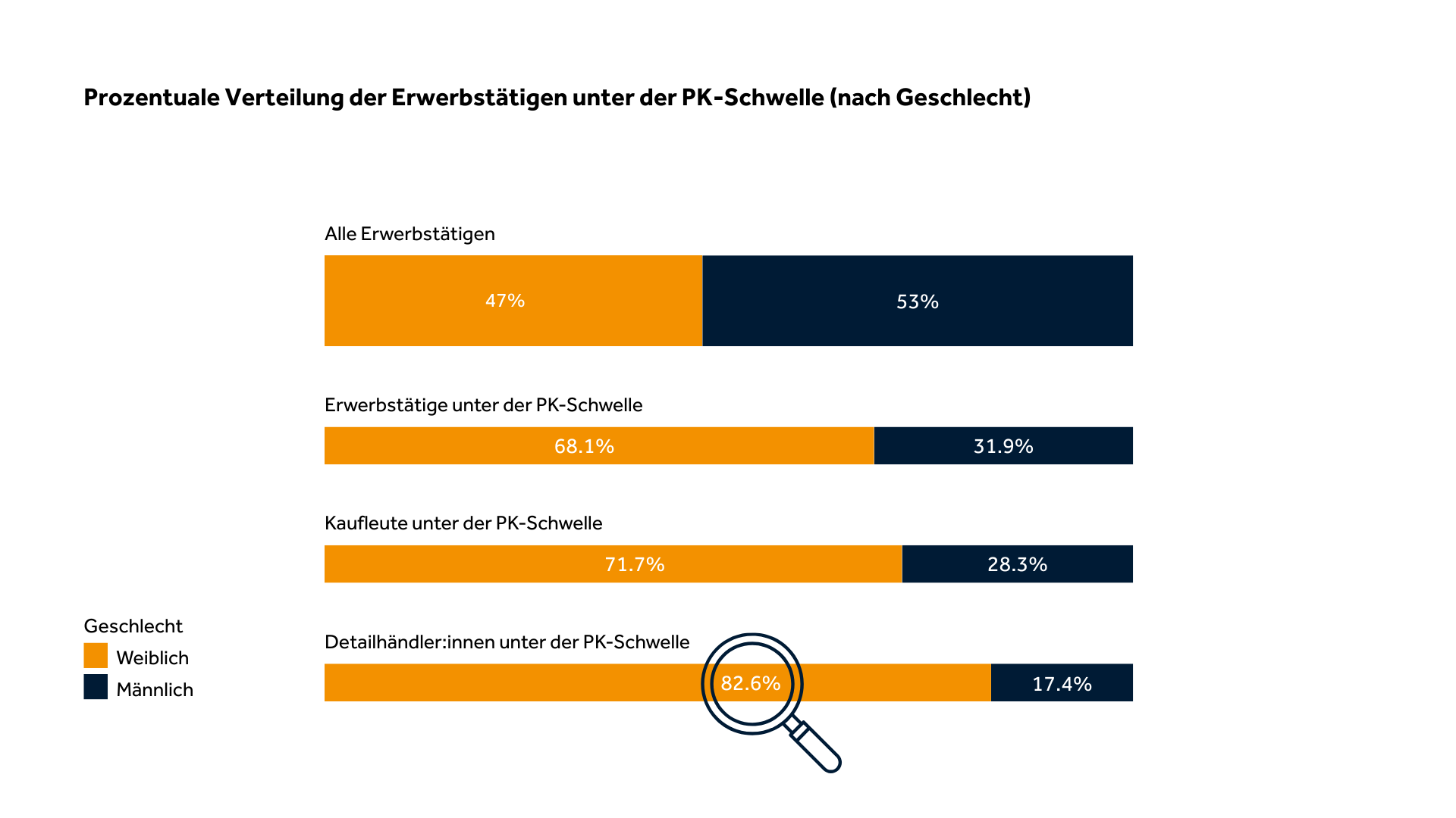Frauen arbeiten überdurchschnittlich oft in Teilzeit – gemäss Bundesamt für Statistik (BfS) fast dreimal so häufig als ihre männlichen Kollegen. Die Mehrheit der Frauen, die in Teilzeit arbeiten und unter der PK-Eintrittsschwelle liegen, tun dies nicht freiwillig: Familiäre Verpflichtungen, wie z.B. Care-Arbeit, zwingen viele in flexible Arbeitsmodelle, die eine nur eingeschränkte oder gar keine ausreichende Altersvorsorge ermöglichen. Im Detailhandel liegt der Frauenanteil unter der PK-Eintrittsschwelle sogar bei über 80%.